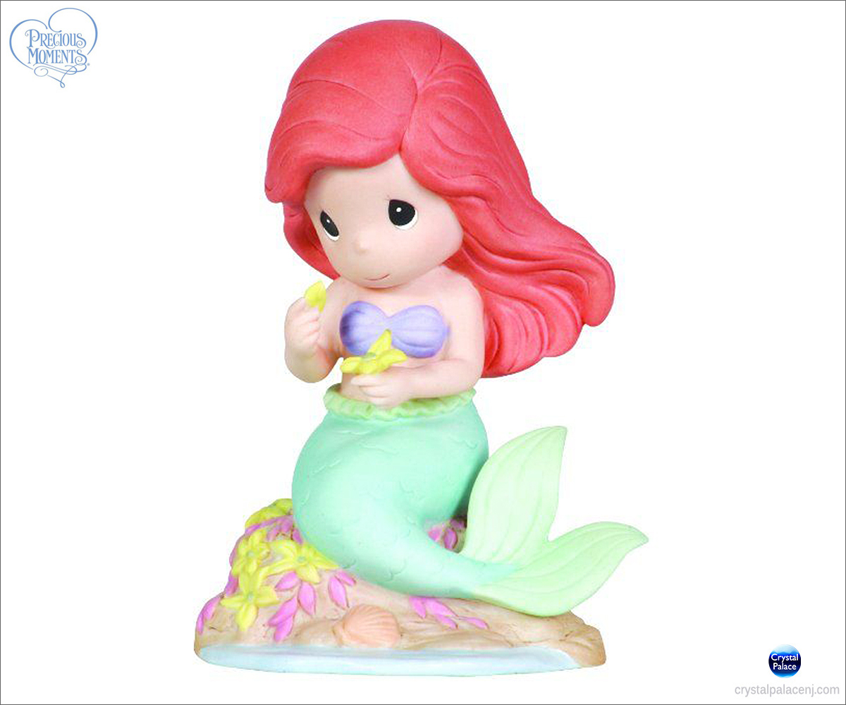 It turns out that mermaids ponder love the same way humans do - petal by petal! Dressed as Disney's® The Little Mermaid this sea-loving sweetie perfectly honors a special love as only a Precious Moments® Disney® figurine can. Bisque porcelain figurine. Disney Showcase Collection.